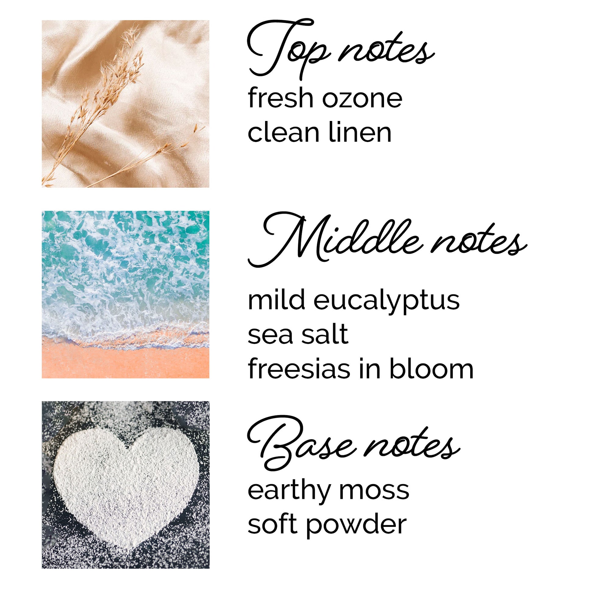 Premium Fragrance Blend – Ozone & linen top notes; eucalyptus, sea salt & freesia in the middle; moss & powder base. Infused with natural essential oils including patchouli, eucalyptus, pine, and citronella.