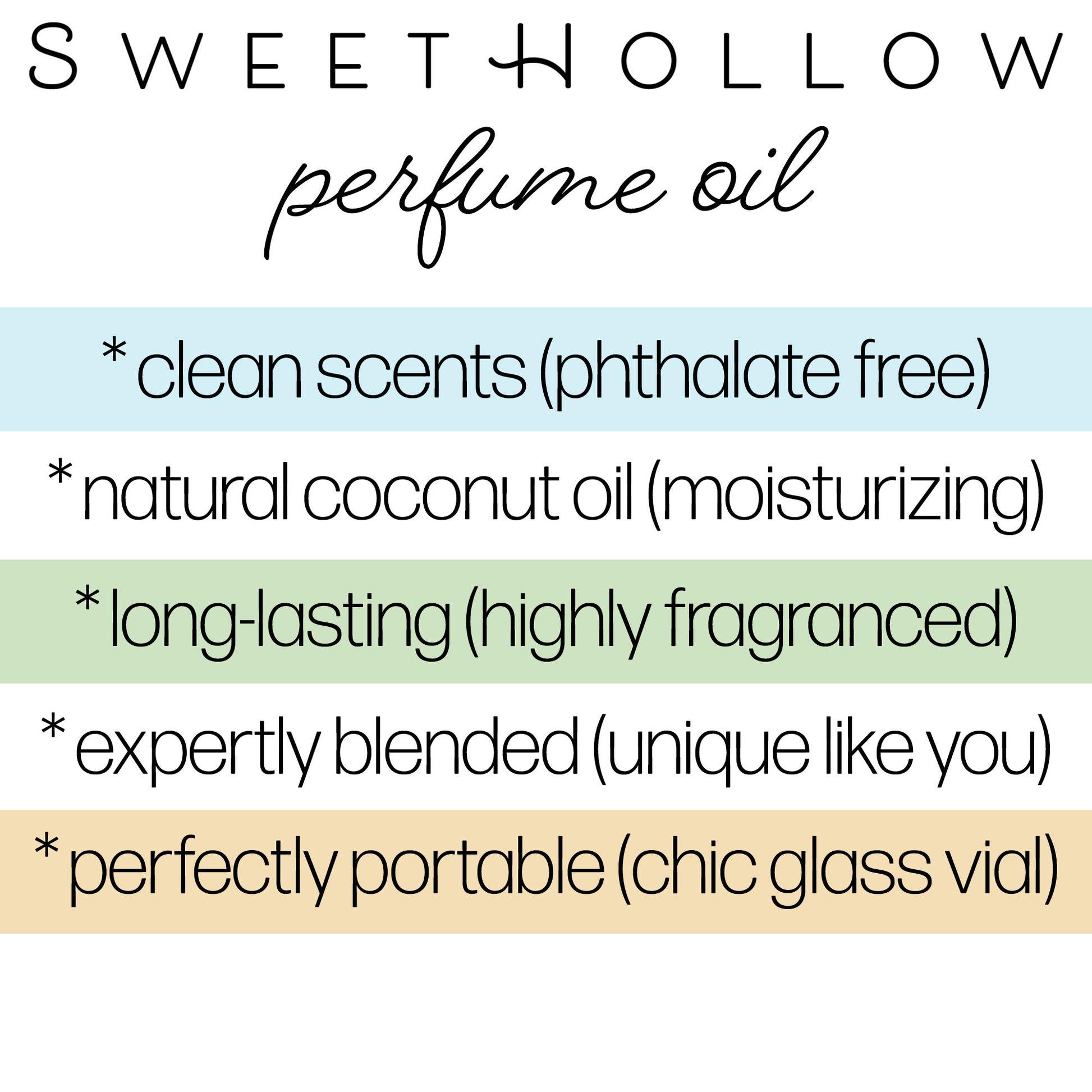 - SIMPLE INGREDIENTS: SweetHollow Perfume Oil is delicately crafted with only natural coconut oil (a moisturizing agent), clean fragrances (free of phthalates), and dipropylene glycol (a hydrating skin-safe component for fragrance longevity).