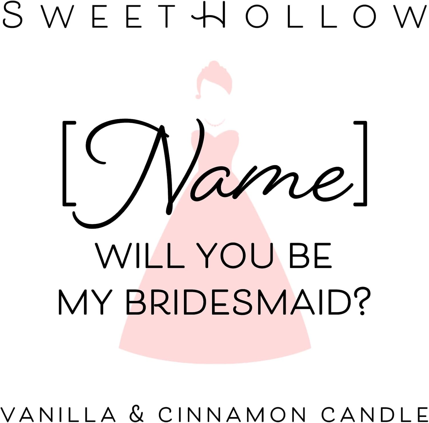 - PERSONALIZED WILL YOU BE MY BRIDESMAID? MESSAGE WITH NAME: With a beautiful minimalist design, this candle is inscribed with the person's name and the words WILL YOU BE MY BRIDESMAID?, the perfect way to pop the question to your besties! Simply add their name when you select Customize & Add to Cart!
